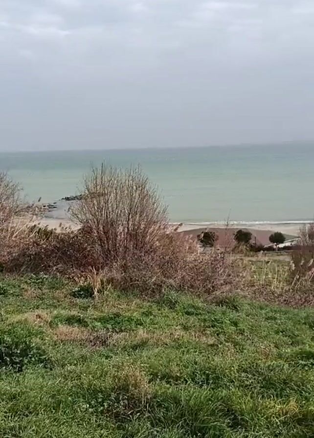 view of a beach from a slightly elevated grassy area. The sky is overcast and grey. The sea is calm with a light green color. A sandy beach runs along the coastline, with some dark green trees or shrubs visible along the edge of the beach. In the foreground, there is a field of green grass and some leafless bushes. The camera appears to be static, with no noticeable movement. The overall scene is peaceful but the overcast sky lends a slightly somber tone.
