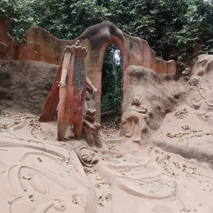 This image captures a section of the Osun-Osogbo Sacred Grove in Osogbo, Nigeria, featuring an outdoor art installation