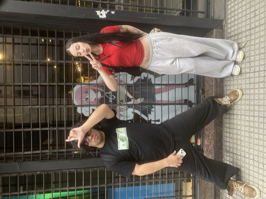 A woman in a red crop top and gray sweatpants stands above a man in a black t-shirt and pants in front of a store with a security gate. The woman makes a peace sign. The man wears glasses and holds a phone. The store behind them has an anime poster. They both are standing on a tiled sidewalk.