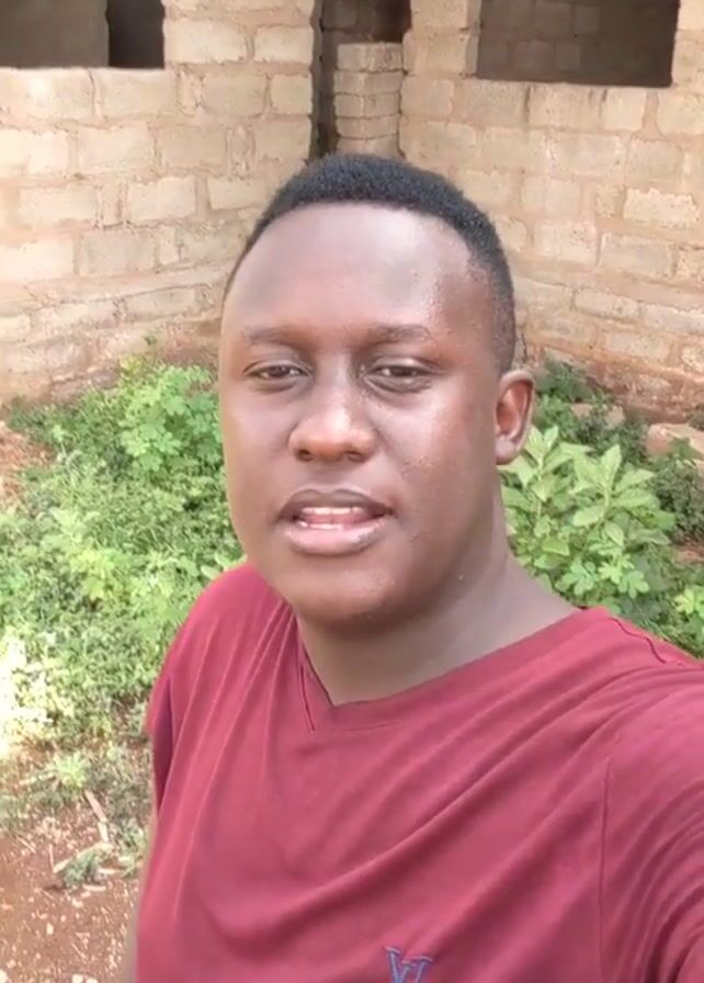 man named Chris standing in front of a partially constructed brick building. The building has window openings and a wooden roof frame but is not yet fully enclosed. The ground around the building is covered with grass and soil. Chris is wearing a maroon t-shirt and is looking directly at the camera. He appears to be recording a video message.