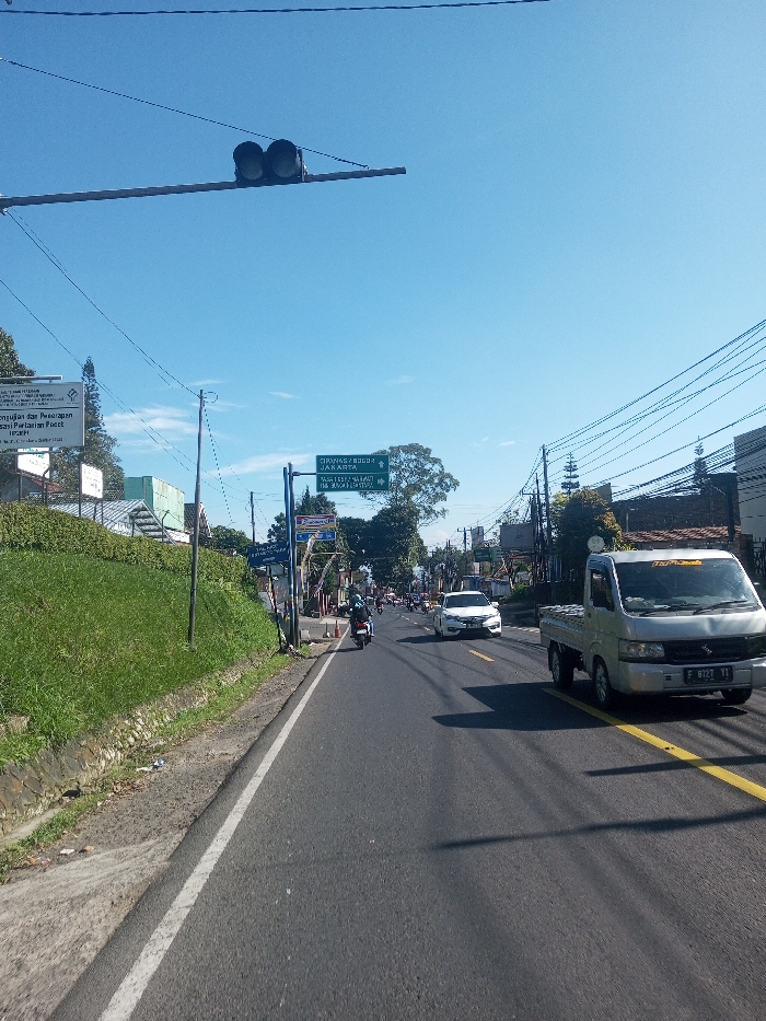 This image depicts a daytime street scene on a multi-lane asphalt road under a clear blue sky. Despite the requested location of Niz Lakuk, India, prominent green road signs identify the area as Indonesia, specifically along routes to Cipanas, Bogor, and Jakarta, with an additional sign pointing to a Regional General Hospital. In the right lane, a silver light pickup truck with license plate F 8127 YI travels away from the viewer. Ahead of it, a white sedan is visible in the left lane, followed by several motorcycles, one with a visible rider wearing a dark helmet and jacket, also traveling away from the viewer. Overhead, two black traffic signal lights are mounted horizontally on a crossbar, and numerous black utility wires crisscross the upper frame. The left side of the road features a white solid shoulder line, a concrete drainage ditch, and a grassy embankment ascending to the left, partially obscuring buildings. A white sign with black text, partially legible, reads "Pengujian dan Penerapan Sistem Pertanian Padi". The right side of the road is bordered by multiple utility poles with complex wiring, an Indomaret convenience store sign, and other commercial or residential structures. Long shadows from unseen objects stretch across the roadway from left to right, indicating the sun is at an angle.
