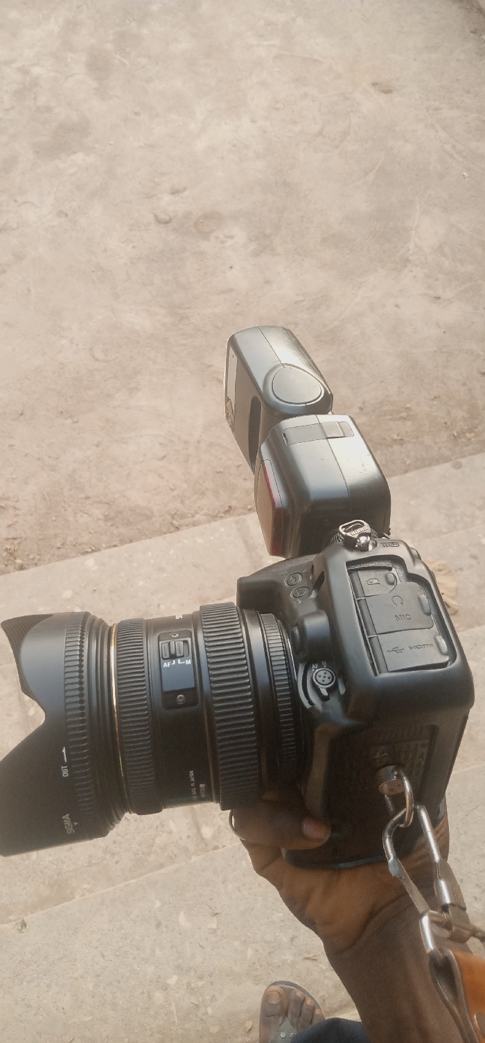 In Kaninkon, Nigeria, a person's dark-skinned hand firmly holds a black DSLR camera, equipped with a Sigma lens featuring an "AF | M" switch and a lens hood. An external black speedlight flash is mounted on the camera's hot shoe. A tan camera strap with silver metal connectors is attached to the camera body. Part of a leg, clad in dark fabric and a dark, open-toed slipper, is visible at the bottom right. The scene is set against a light-colored, textured ground surface, possibly concrete or tiled, exhibiting minor discoloration and wear, with a subtle horizontal line indicating a step or edge in the immediate vicinity.