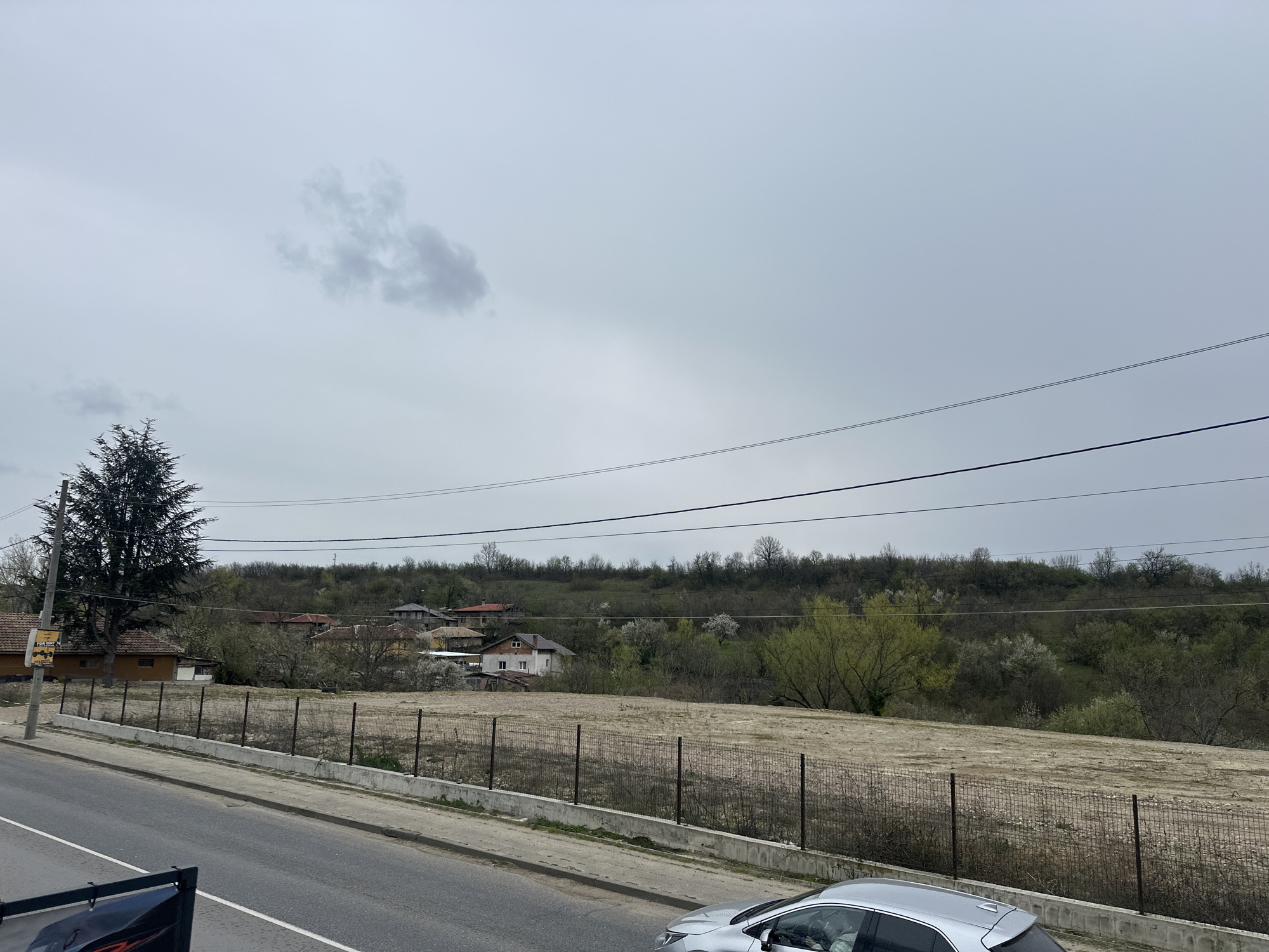 view of Sheremetia, Bulgaria on an overcast day. In the foreground is a road with a silver car parked on the side. A grey concrete barrier runs alongside the road, separating it from a large, fenced-off dirt plot. Behind the plot are houses with tiled roofs, partially obscured by trees and shrubbery. A tree with dense, dark green foliage stands to the left of the houses. Power lines stretch across the sky above the trees. The sky is grey and cloudy.
