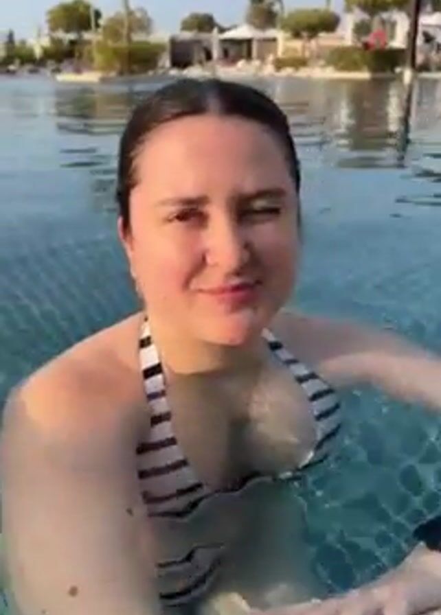 A woman in a black and white striped bathing suit stands in a swimming pool on a sunny day