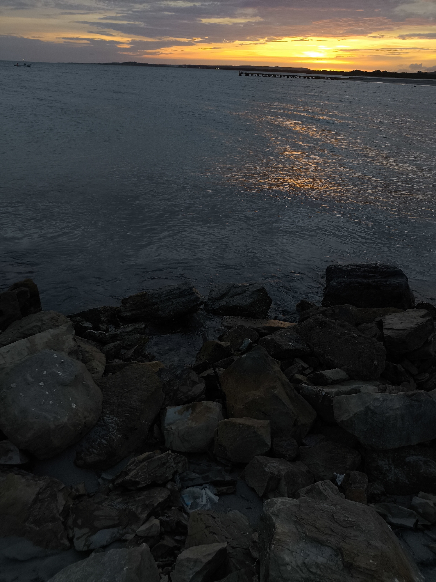 The image depicts a seascape at El Yaque, Venezuela, captured during a sunset. The foreground features a rocky shoreline with various sizes of dark-colored rocks and boulders. The water extends from the shoreline towards the horizon, reflecting the orange and yellow hues of the setting sun. A faint outline of land is visible in the distance. A small boat is also present in the upper left corner of the frame.