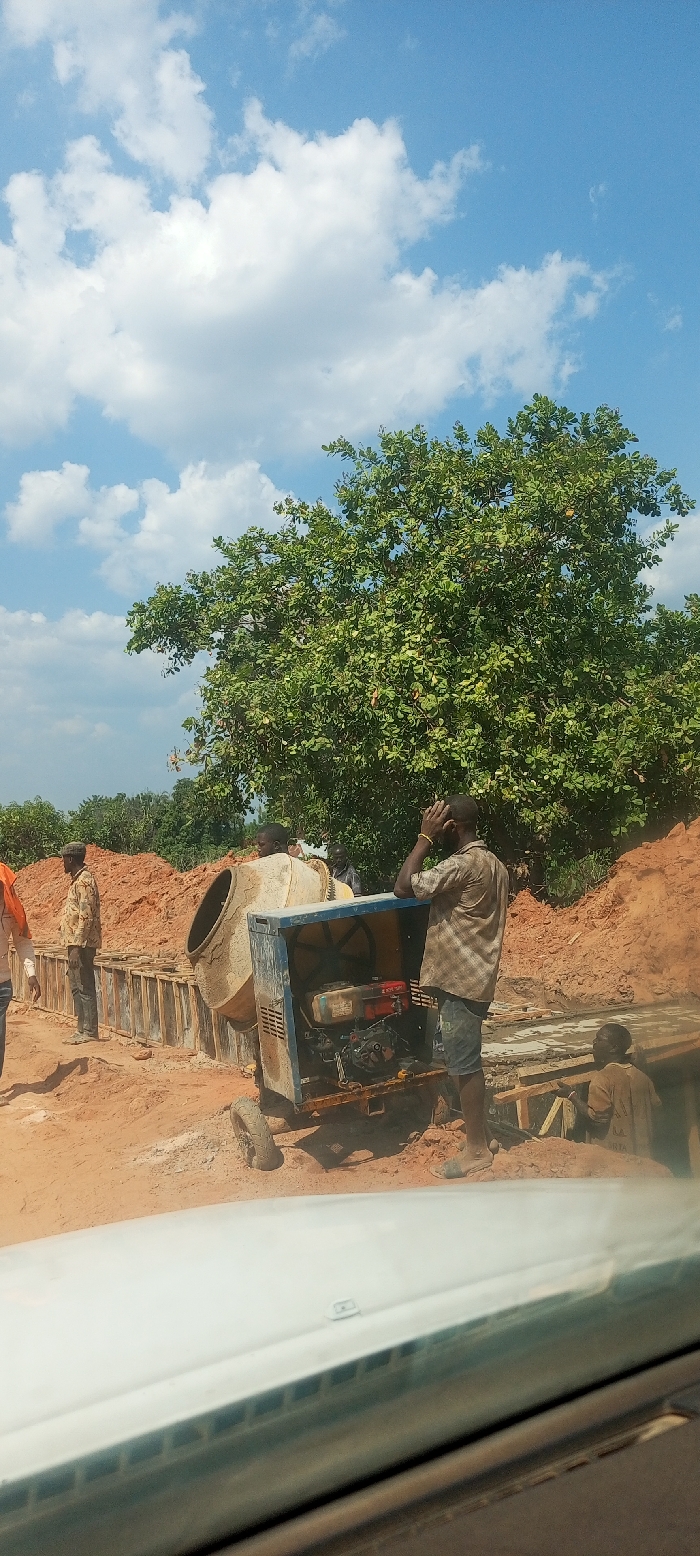 The image depicts an outdoor construction site in Ayale, Nigeria, under a bright blue sky with scattered white cumulus clouds