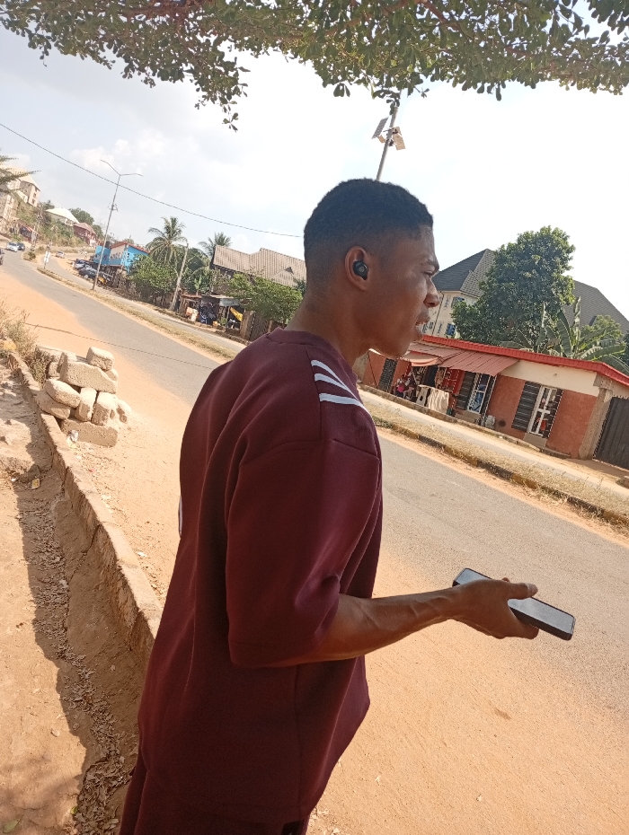 A young man stands on a roadside, clad in a maroon sweatshirt with white stripes on the sleeves. He holds a smartphone in his hand, with an earbud visible in his ear. A street and buildings form the background, partially obscured by trees overhead. The image captures a casual, candid moment in an outdoor setting.