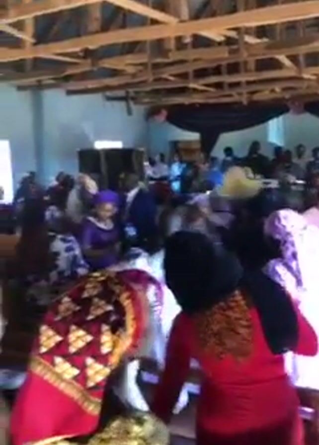 The video depicts a vibrant scene inside a building, likely a church or community hall, with a large group of people dressed in colorful, traditional African attire
