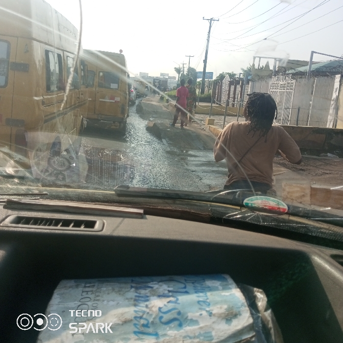 The view from inside a vehicle shows a flooded road in front of yellow buses and pedestrians. A person with dreadlocks wearing a tan shirt stands in the street with their back to the camera. The car's dashboard is in the foreground, displaying air vents, a book wrapped in plastic, and the brand "TECNO SPARK." Overhead power lines are visible against a bright sky. The surrounding buildings include fences and gated structures.