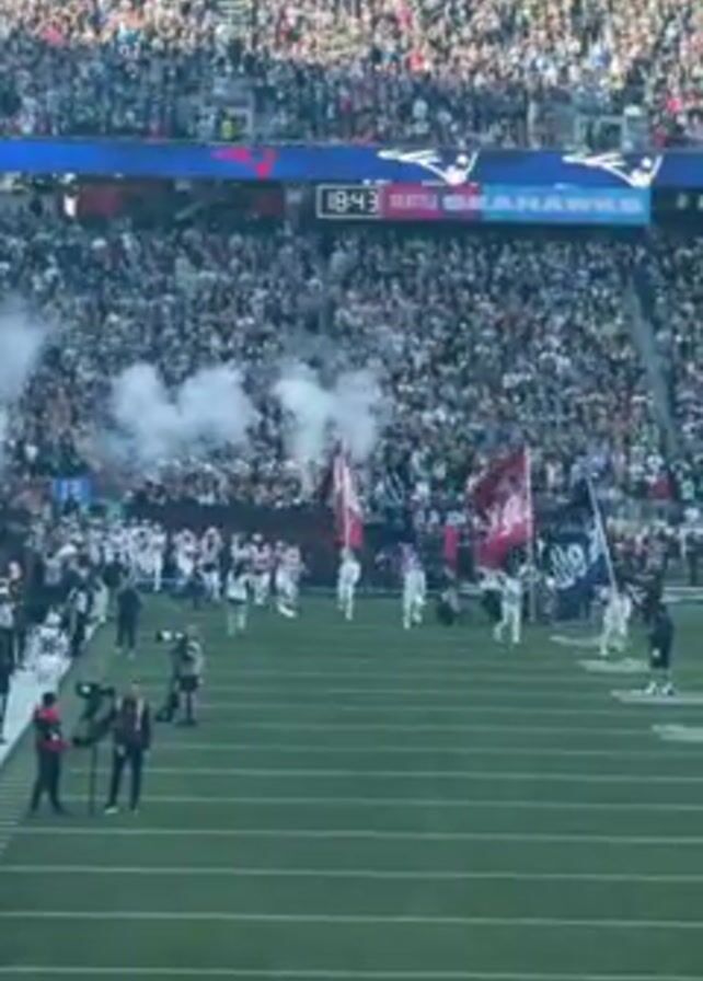 large American football stadium filled with spectators, with a football team running onto the field through white smoke, waving flags, followed by staff and photographers. The field is green, and the atmosphere is energetic. The scoreboard shows a game between the Seattle Seahawks and another team, with "Patriots" visible on the scoreboard.