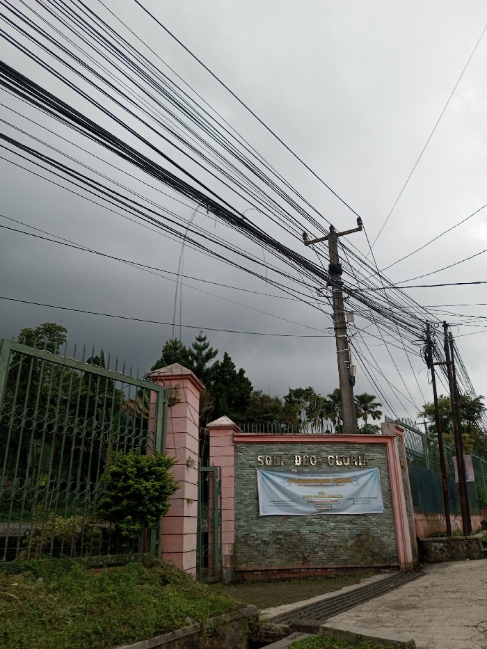 A gate with a sign "SOLI DEO GLORIA" in front of what appears to be an institution. A fence is to the left and right of the gate. Overhanging the structure are many electrical wires attached to utility poles. The sky is overcast, suggesting possible rain. Vegetation lines the ground near the gate and fence.