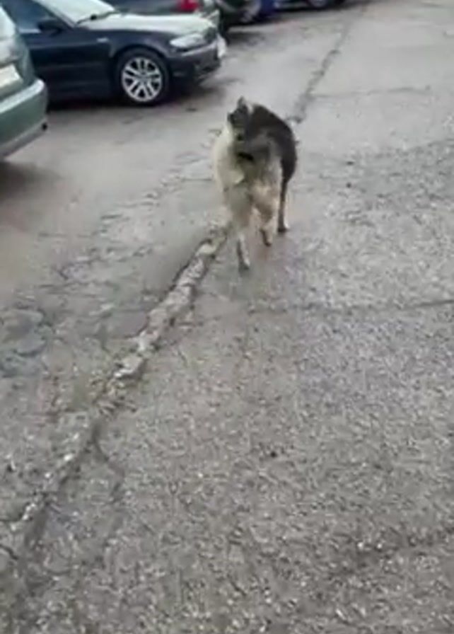 A video shows two dogs in an asphalt parking lot