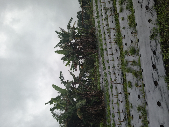 The image depicts an agricultural field under an overcast sky in An Khe Ward, Vietnam. In the foreground and midground, a series of parallel rows are covered with black plastic mulch sheeting, each featuring regularly spaced circular cutouts. Within these cutouts and between the rows, sparse green vegetation is visible, including small plants and taller, dried stalks approximately 20-30 cm in height. The plastic sheeting appears to be stretched over raised beds. In the background, two prominent clusters of tall banana trees with large green and partially desiccated leaves dominate the left and center. Additional dense green foliage is visible behind the banana trees, extending towards the horizon. The sky is uniformly light gray, indicating full cloud cover. No individuals or active subjects are present within the frame.