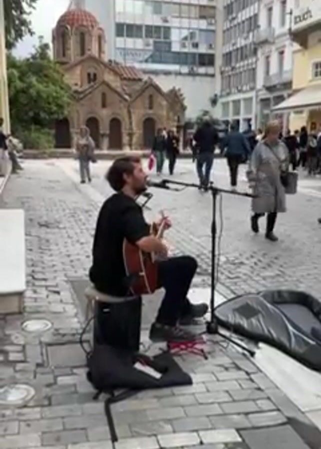 A street musician plays guitar and sings into a microphone while sitting on a stool on a cobblestone street