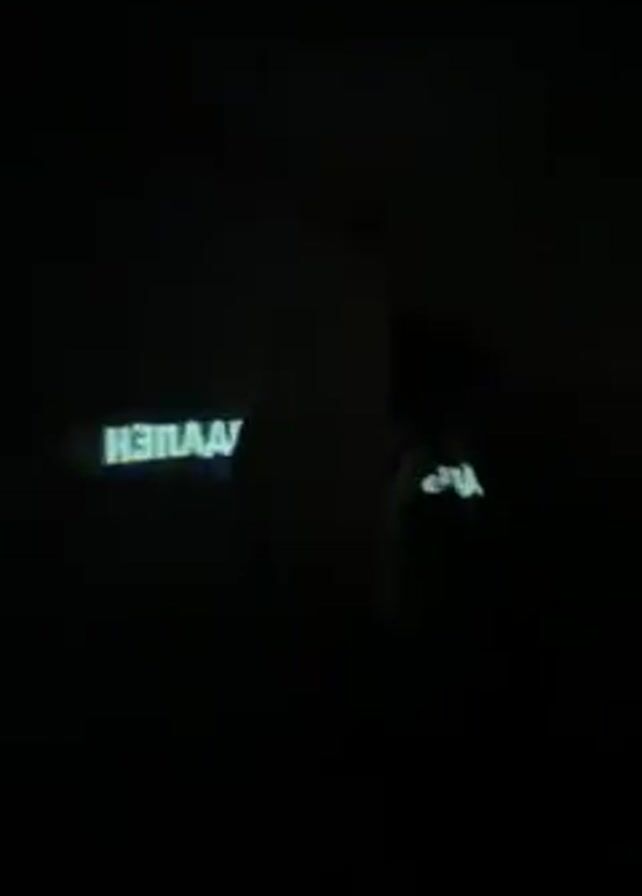 dark room with several people. The faces and clothes of the people are not visible because of the darkness. Two screens are glowing with text on them, but the text is blurry and unreadable. One of the people is drinking from a cup or bottle.