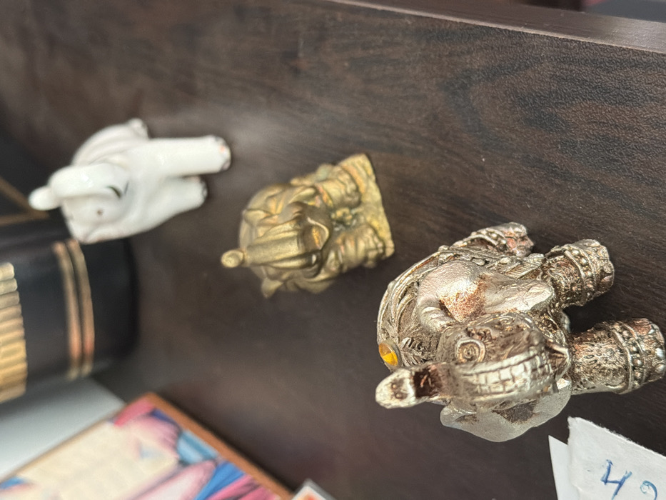 The image displays an indoor scene on a dark brown, textured surface, likely a shelf or desk, located in Burgas, Bulgaria. Three elephant figurines are arranged diagonally from the foreground to the background. The foremost figurine is a silver-colored elephant, intricately detailed with decorative patterns and an amber-colored gem set on its head. Its trunk is raised. The surface of this figurine shows areas of reddish-brown discoloration. Directly behind it, a smaller gold-colored elephant figurine is positioned, also with a raised trunk, resting on a small base. The rearmost figurine is a smooth, white porcelain or ceramic elephant with a slightly raised trunk. In the blurred background on the far left, a portion of a framed object is visible, revealing vibrant blue and pink colors, possibly from a painting or icon. Adjacent to this and slightly to the right, a dark, possibly black, cylindrical bottle with horizontal gold bands and indistinct lettering is present. To the left of the silver elephant, a small, irregularly torn piece of white paper is visible, featuring partially legible blue handwriting that includes the letters "ch". No individuals are present in the scene, and all objects are static.