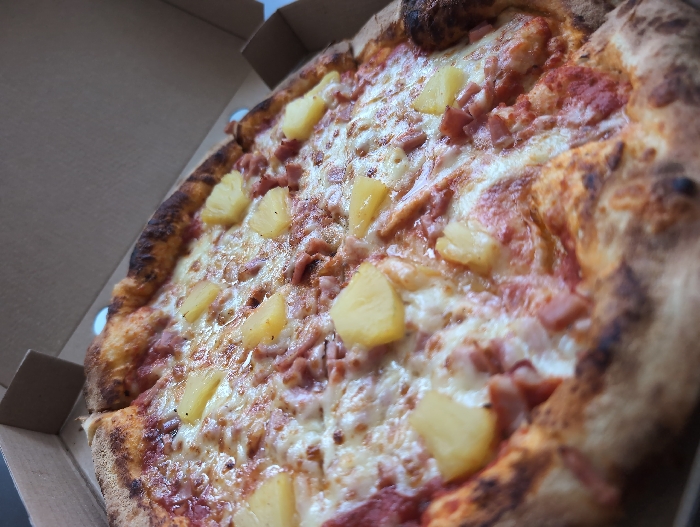 The scene depicts a full, circular pizza resting inside an open, light-brown corrugated cardboard delivery box. The pizza is topped with a melted, bubbly white cheese layer, scattered pieces of diced pink ham, and numerous yellow, approximately square-shaped pineapple chunks, all situated over a red tomato sauce base. The crust is thick, appears slightly raised, and exhibits areas of golden-brown baking with minor, localized charring. No individuals or external environmental features are visible beyond the interior of the pizza box. This scene is located in the city of Vidin, Bulgaria.