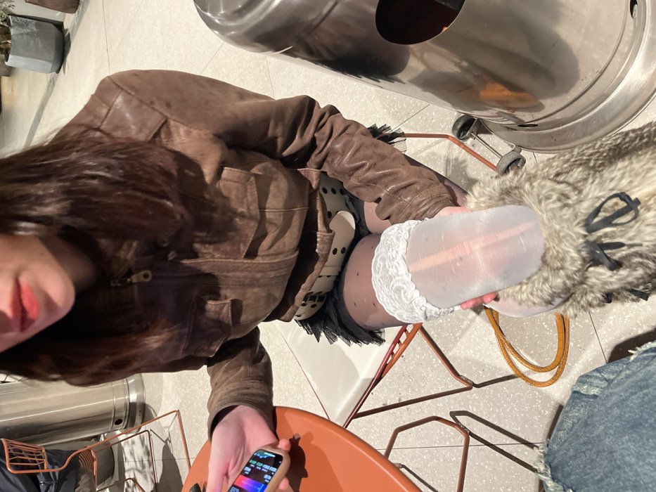 A person wearing a brown leather jacket, patterned tights, and white lace-trimmed stockings sits near a metallic patio heater. They are seated on a chair with a metal frame and an orange seat. They are holding a smartphone or similar device. A furry boot or shoe with dark laces is in the foreground, and a person wearing denim sits beside them. The scene appears to be outside or in a semi-outdoor setting with a tiled floor.
