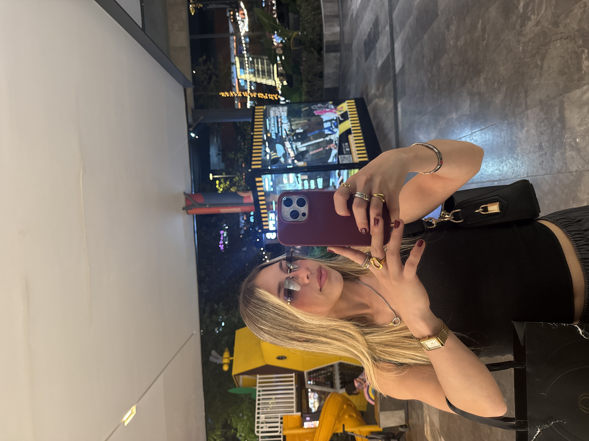 A young adult female with long, blonde hair and dark red fingernails is centered, taking a selfie with a maroon iPhone in her right hand. She wears a black ribbed tank top, grey pants, rectangular rimless sunglasses, a silver necklace with a circular pendant, multiple gold and silver rings, a gold-toned rectangular wrist watch, and a silver bracelet. She holds a black shopping bag in her left hand and a black handbag with a gold padlock accessory on her right side. The background is an outdoor commercial or entertainment complex at night, illuminated by overhead lights and ambient city lights. To the left, a children's playground structure, predominantly yellow with white railings, a yellow slide, and a yellow bee-shaped ornament, is visible. A partially obscured figure is behind the playground. To the right, an illuminated display kiosk with black and yellow stripes showcases images of scooters or similar products. Further back, modern buildings with illuminated windows and decorative string lights are visible against the dark sky. The ground is paved with patterned grey tiles. This scene is situated within a modern commercial area, consistent with a shopping mall courtyard, in San Agustín, Mexico.