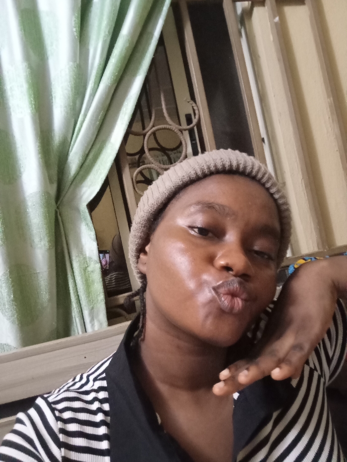 A young woman wearing a beanie and a striped shirt poses for a selfie. She has dark skin, a serious expression, and is puckering her lips into a kiss. Her hand is raised to her face. Behind her is a window with a patterned curtain and a decorative metal grate. The scene is lit with soft, natural light, creating a casual and intimate feel.