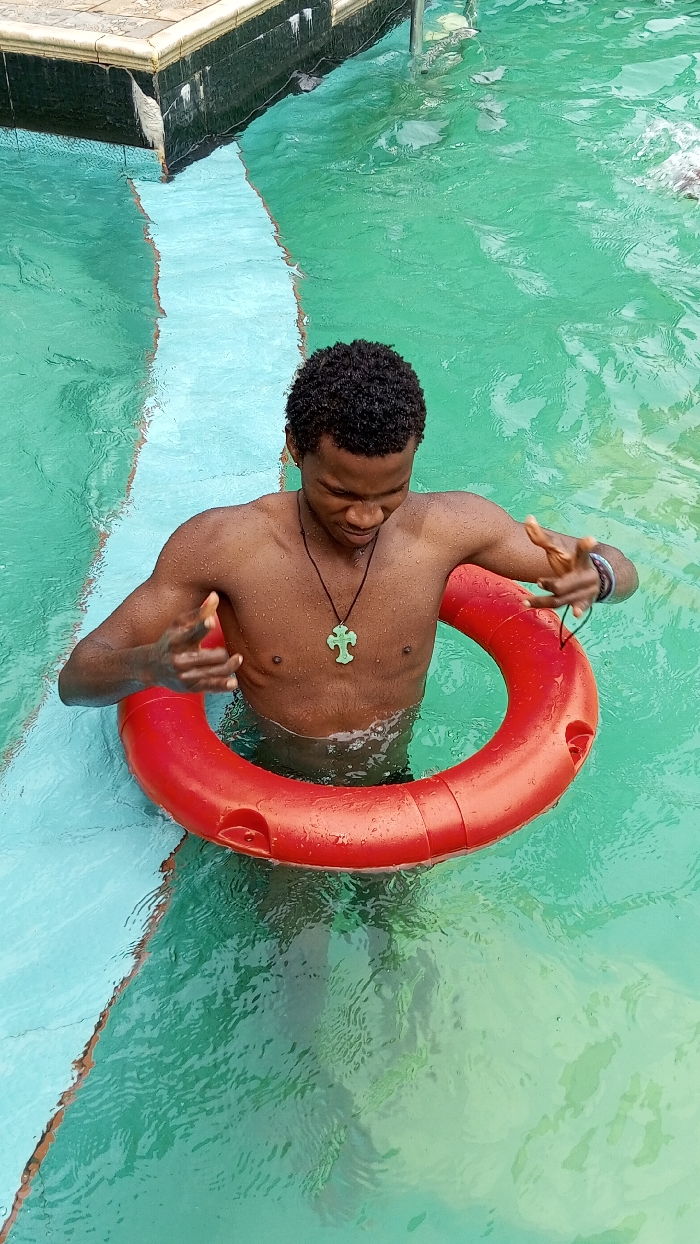 A male subject with dark skin and short, curly dark hair is depicted chest-deep in a swimming pool, encircled by a red lifebuoy