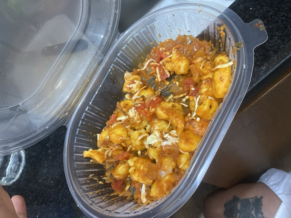 An open container of gnocchi with tomato sauce and shredded cheese sits on a dark surface next to its lid. The translucent container is rectangular with rounded corners. The gnocchi is coated in a vibrant red sauce, and the cheese is sparsely sprinkled on top. The background includes glimpses of a table or countertop and a person wearing white clothing with a tattoo visible on their leg.