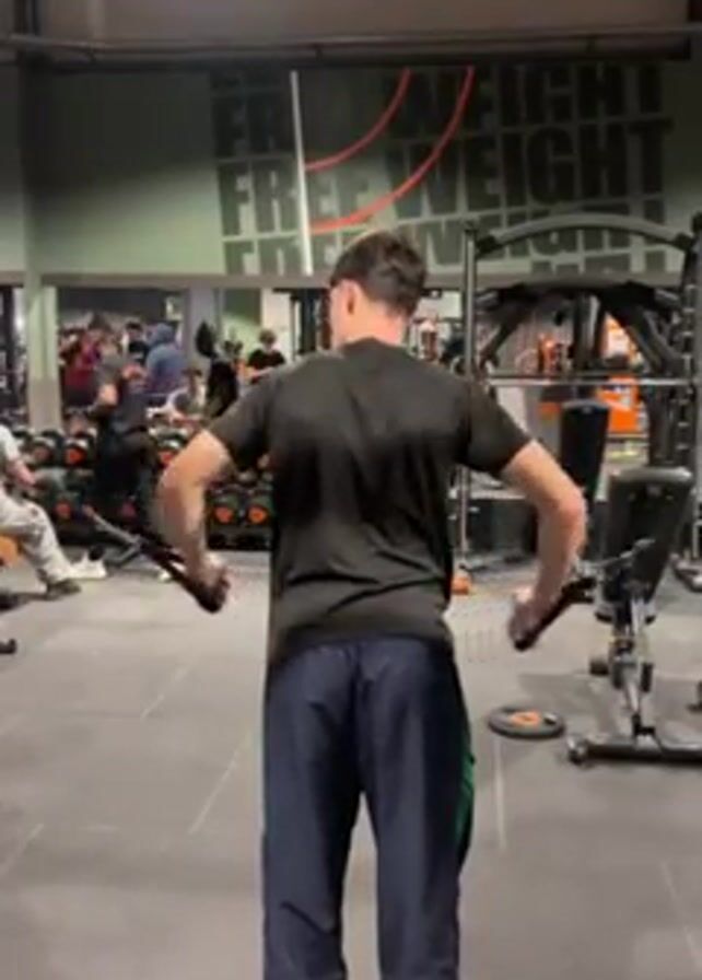 A person in a black shirt and blue sweatpants is working out at a gym. They are performing a rear delt fly exercise using a cable machine. The gym has various weights and equipment, with other people working out in the background. The gym also has a sign that says "FREE WEIGHT" on one of its walls. The person stands facing away from the camera during the entire video.