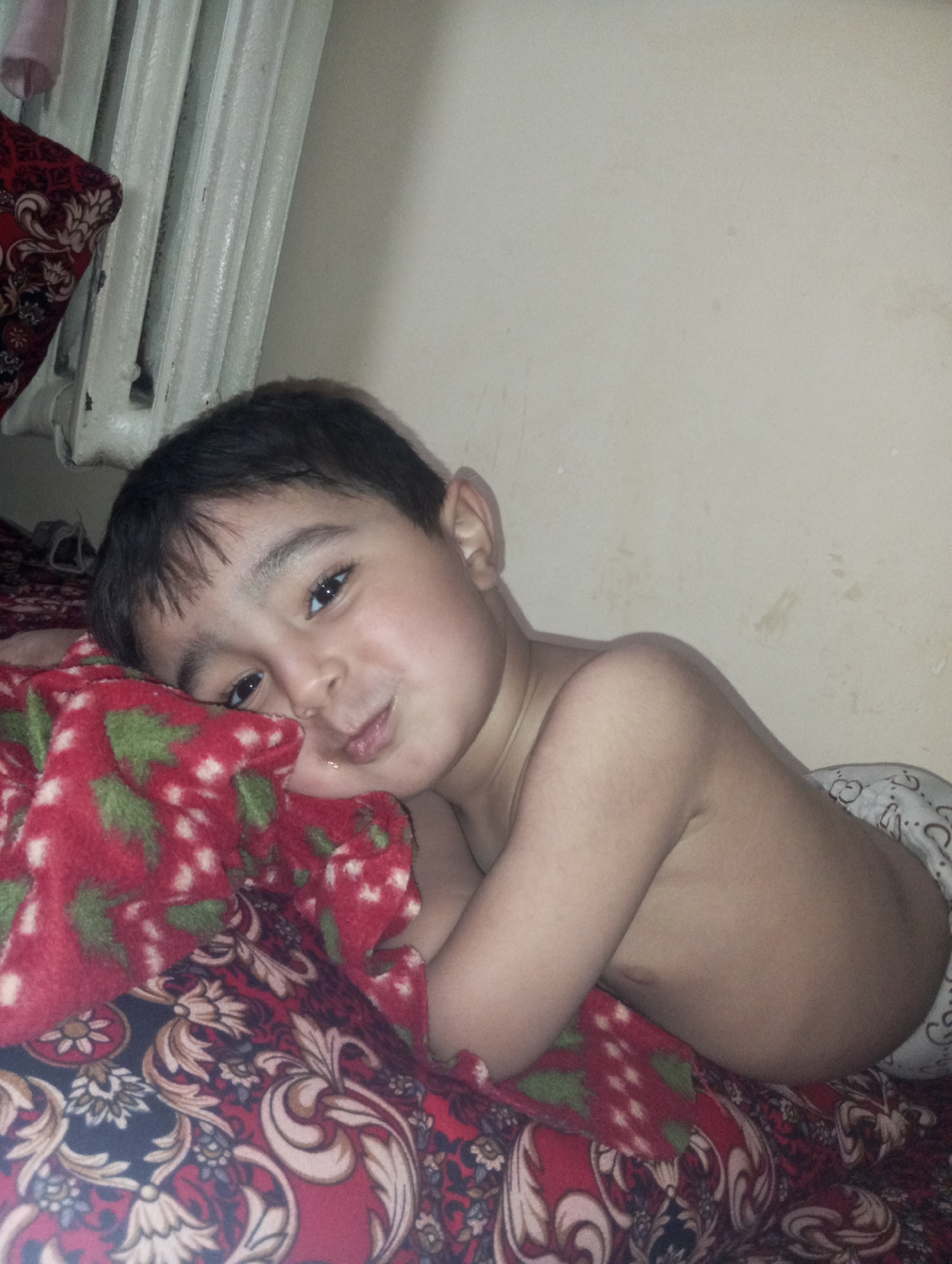 A young child with dark hair and eyes lies on a patterned bed, resting their head on a red and green blanket. The child's skin is fair, and their expression is serene. The background shows a radiator and a plain wall. The overall lighting is soft, creating a cozy and intimate atmosphere.