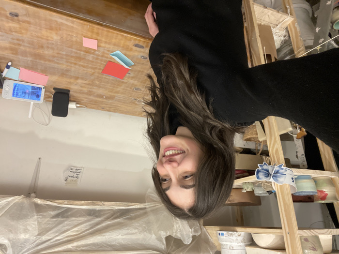 A woman with long brown hair and a black turtleneck smiles. A wooden table holds a baby monitor, phone charger, and colorful papers. In the background, a wooden shelf displays pottery. Plastic sheeting covers items below the table. A white wall has handwritten notes. The entire image appears rotated, with the woman's head on the lower left corner.