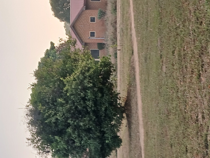 A landscape photo, oriented vertically, features a large, green tree in the foreground. Behind the tree is a brick building with visible windows and a red roof. A light-colored dirt path runs alongside the tree and into the distance, dividing the image between the tree/building side and a grassy area on the right. The sky is pale and appears hazy. The overall image quality is somewhat blurred.