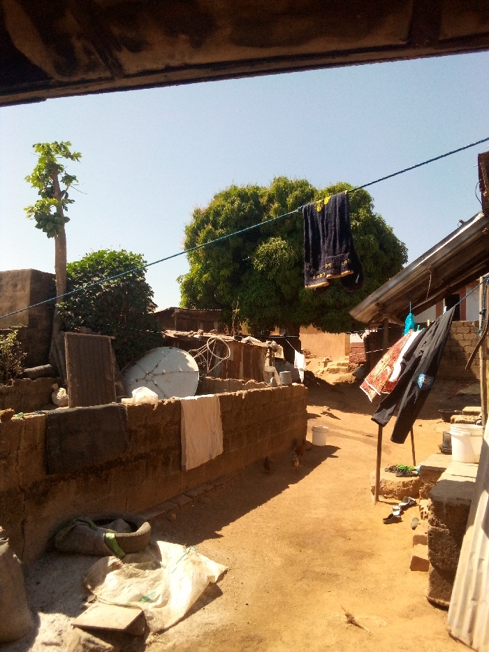 The image depicts an outdoor scene in Jos, Nigeria, under bright daylight with a clear blue sky, casting distinct shadows. The ground is primarily reddish-brown dirt. Overhead, a dark brown structure or overhang partially frames the top of the view. In the lower left foreground, a white woven sack and a section of a black rubber tire rest on the dirt. Along the left side of the midground, a tall, slender papaya tree bears green fruit. Behind it stands a light-colored concrete block structure, partially obscured by a dense green bush. A low wall of reddish-brown concrete blocks extends horizontally, with a dark cloth and a white cloth draped over it. Behind this wall, a white satellite dish lies on its side, surrounded by corrugated metal structures and a leaning wooden panel. A blue rope, serving as a clothesline, stretches across the upper midground, with a dark blue towel hanging from it. Further to the right, a makeshift clothesline, supported by two wooden sticks, holds a patterned garment and a black jacket. A white plastic bucket rests on a low concrete block structure on the right, with another bucket visible further along the dirt path. At least three small chickens or birds are visible on the dirt near the low wall, and a lizard is present on the path in the lower right. A large, dense green tree with a rounded canopy dominates the background. No human figures are visible.