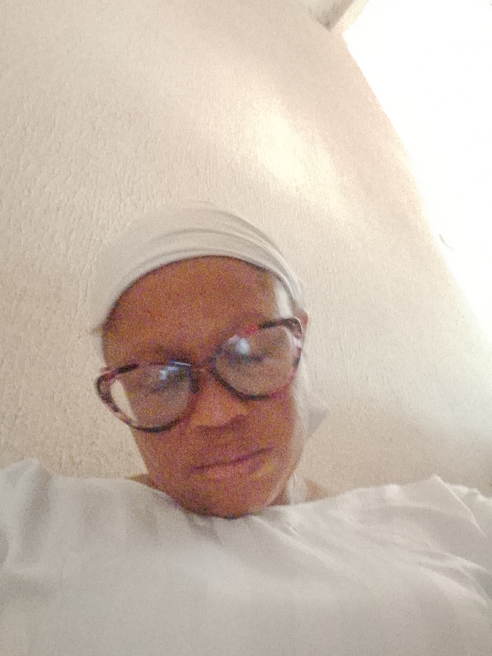 A close-up, low-angle portrait features an individual from the chest up against a textured, light-colored interior wall. The subject has brown skin, wears a plain white head covering, and a plain white upper garment. Eyeglasses with thick, dark-patterned frames are worn, and the face displays a neutral to slightly smiling expression. The upper right background area is brighter, suggesting a light source or opening. No specific visual identifiers are present within the image to determine a precise location within Lagos, Nigeria. The image exhibits digital noise.