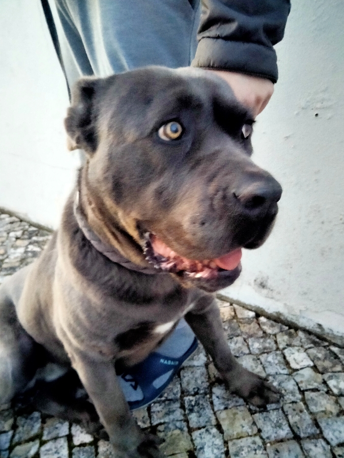 A gray Cane Corso dog with amber eyes, a collar, and cropped ears sits on cobblestones. The dog's mouth is slightly open, revealing its teeth and tongue. Part of a person's arm and dark puffer jacket sleeve are visible at the dog's head. Another person, wearing light-colored pants and blue shoes is close to the dog, which is sitting on one foot. A partially visible white wall is in the background.