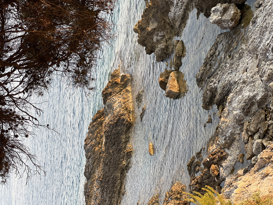 A high-angle shot presents a rocky coastline where land meets water. To the left, branches with sparse foliage overhang. The water is calm, with subtle ripples reflecting light. Rocks jut out from the water, creating a textured shoreline. The rocks transition from a sun-drenched tan to cooler grays. A patch of green plants is visible in the bottom right corner.