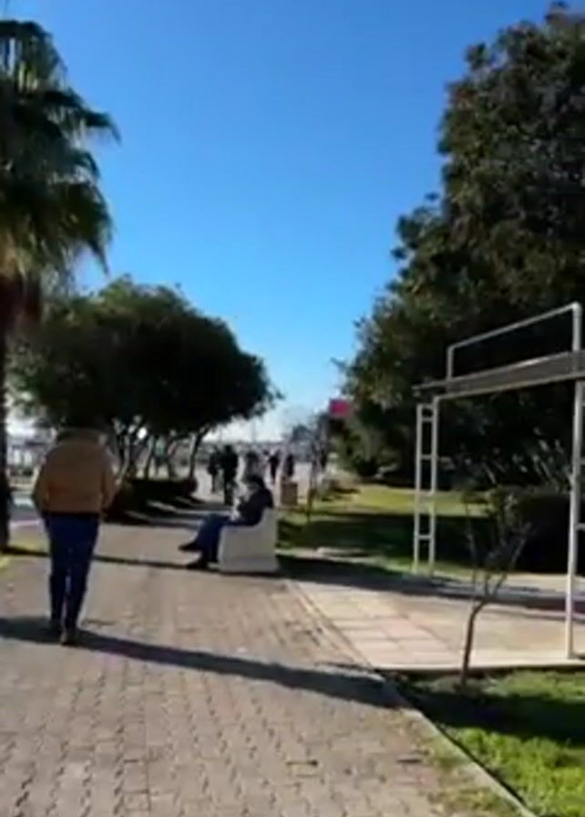 man walking down a paved walkway, with palm trees and other foliage on one side, and a road with traffic and a body of water on the other side. A few people are seen sitting on benches along the walkway. The camera follows the man for a brief moment before turning to show a woman with short brown hair and sunglasses walking past a metal fitness structure in the park. The sky is blue and sunny.
