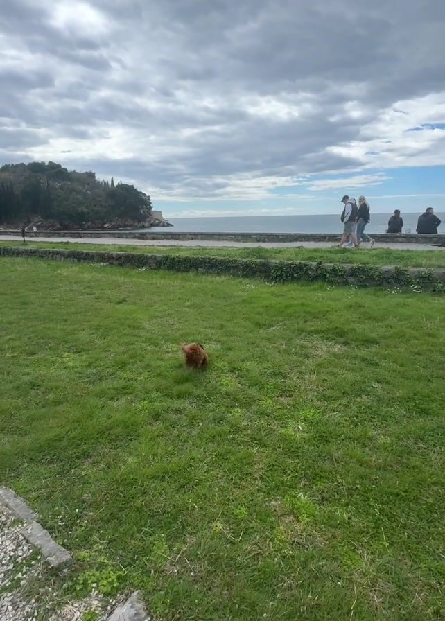 small brown dog wearing a black shirt on a green lawn. The dog runs forward, stops, and then sniffs the ground. In the background, there is a coastline with an island, a body of water, and a cloudy sky. People are walking along a path near the water. The lawn is bordered by a stone pathway.