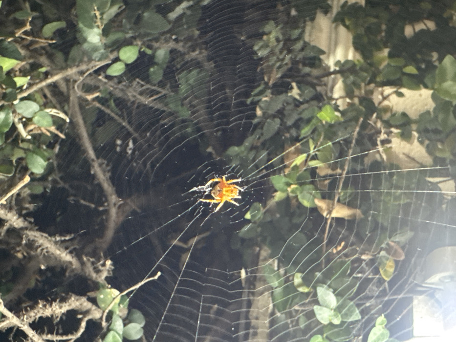 - "An arachnid, identified as an orb-weaving spider with an orange-red abdomen and lighter cephalothorax and legs, is centrally suspended within its intricate, radial orb web" by FM-Qp34C2, licensed under CC BY 4.0