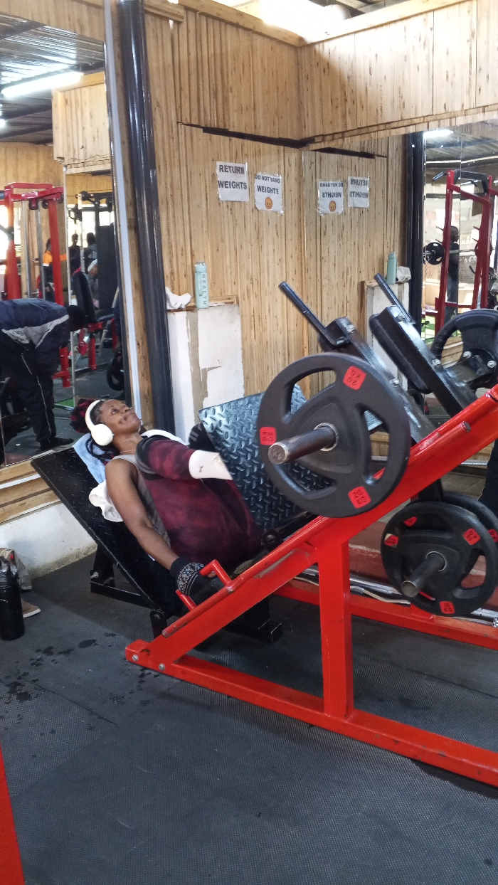 - "In a gym setting, a person wearing headphones and fitness attire is using a red leg press machine loaded with weights" by FM-hTtyx1, licensed under CC BY 4.0