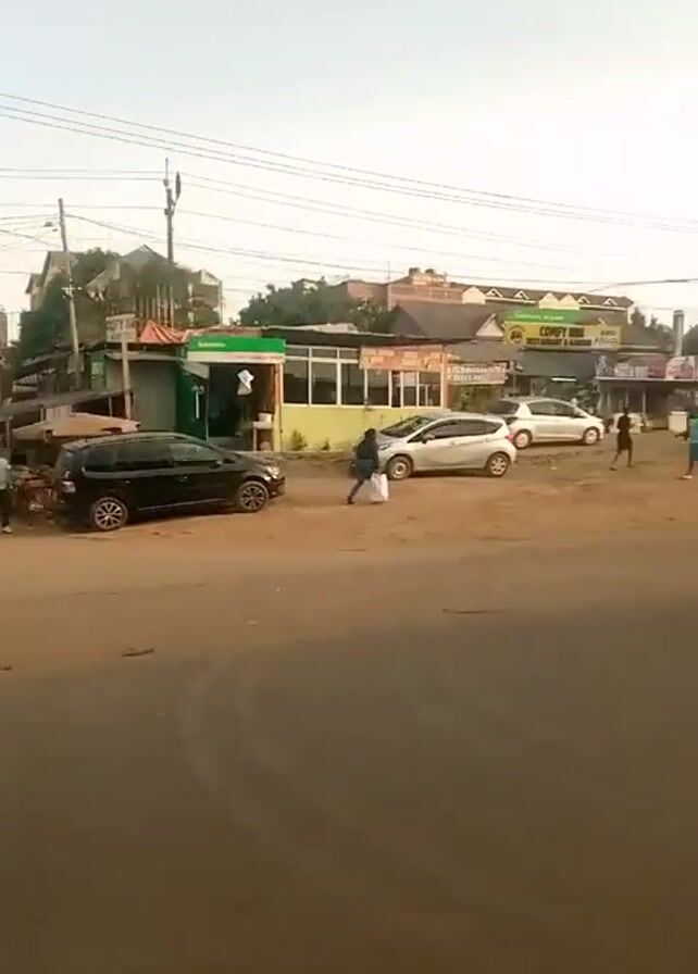 street scene in a populated area. Several people are walking, standing, and interacting on the sidewalks. Cars and motorcycles are moving along the road. Buildings and businesses are visible, including a Pizza Inn and a Comfy Inn. There is a large billboard advertising a "Variety Feast" from Chicken Inn. A white van with "RUNA SACCO" written on the side drives past. Overhead power lines and a cell tower are also visible in the background. The overall lighting suggests it is daytime. The ground appears to be dirt or unpaved in some areas.