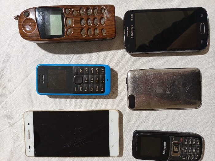 - "six electronic devices: two Nokia feature phones (one with a wooden-like casing and another with a blue casing), a Samsung smartphone with the word "DUOS" on it, a silver iPod, another Samsung feature phone with a black casing, and a white smartphone with a cracked screen" by FM-UTT6r2, licensed under CC BY 4.0