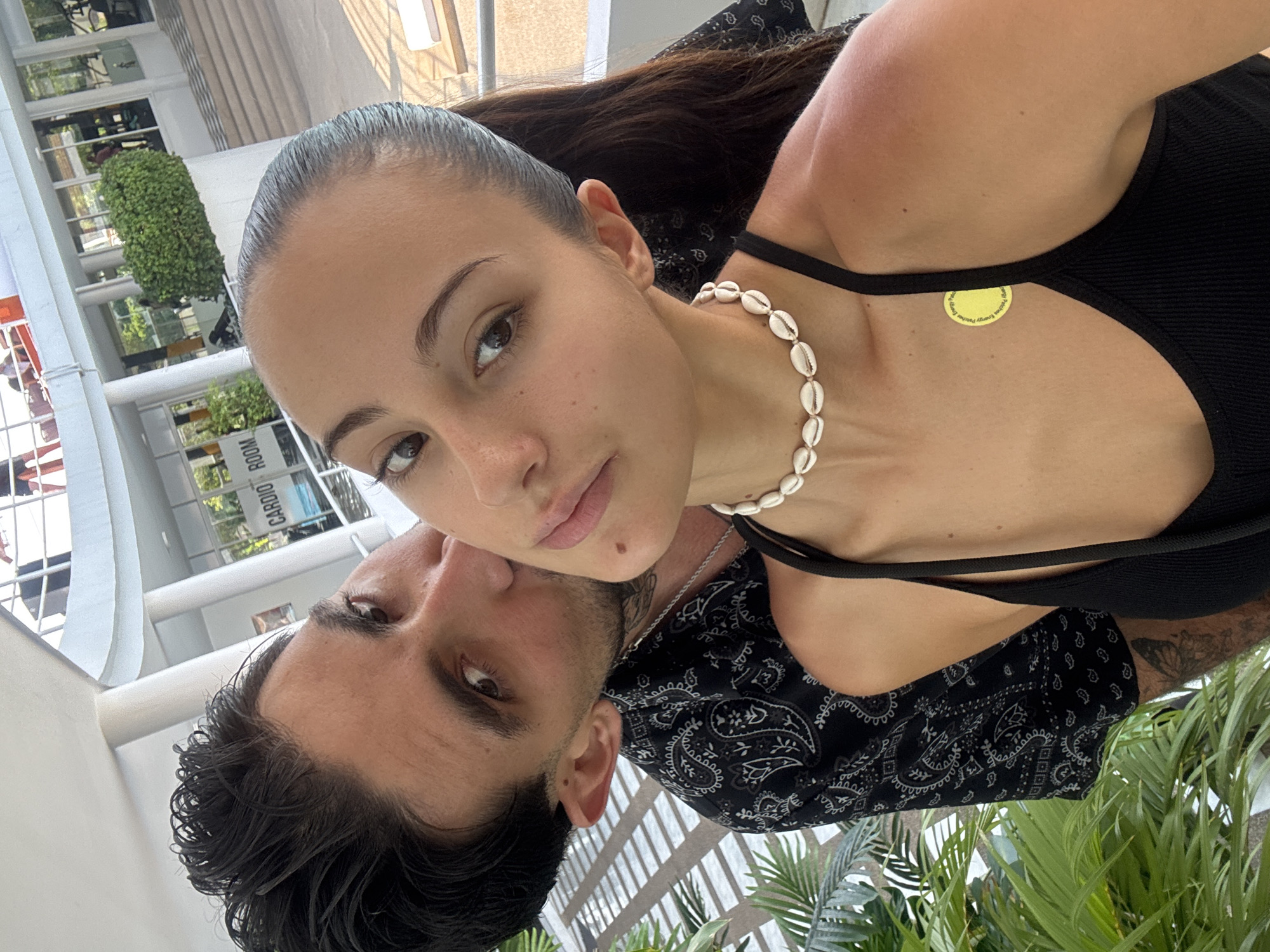 The image depicts two individuals, a woman and a man, in an outdoor setting identified as Kathu, Thailand. The woman is positioned in the foreground, appearing to capture a selfie. She has dark hair pulled into a ponytail, light skin, and brown eyes. She wears a black ribbed tank top and a white seashell choker necklace. A circular yellow patch, partially legible as "Energy Patches," is affixed to her upper left chest, adjacent to the left shoulder strap. She maintains direct eye contact with the camera. Behind the woman, the man is visible, leaning in and kissing her right cheek. He has dark hair, stubble on his face, and multiple tattoos, including one resembling a butterfly on his left arm and additional patterns on his neck. He wears a black shirt with a white paisley pattern and a silver chain necklace. His gaze is directed towards the camera. The background reveals a modern building with large glass windows and white pillars. A sign on a glass door clearly reads "CARDIO ROOM," indicating a fitness facility. Green foliage, resembling palm fronds, is visible in the lower left portion of the frame, and white slatted structures are present on the left side, behind the man.