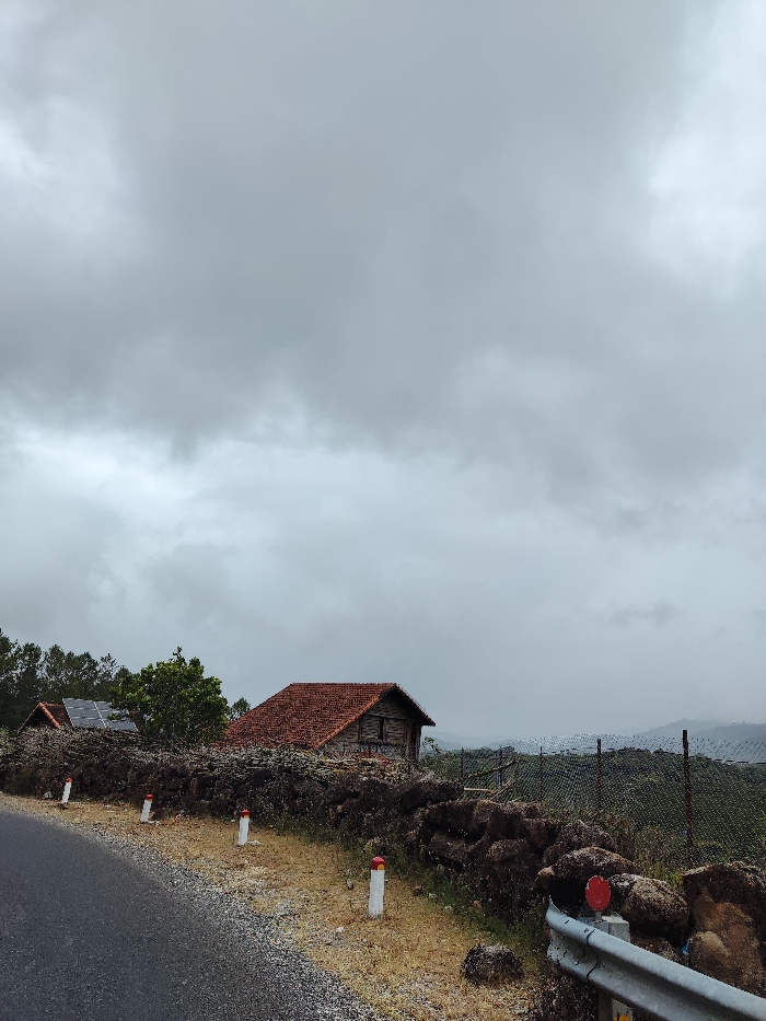 The scene depicts a rural roadside in Lán Tranh, Vietnam, under a uniformly overcast, gray sky. A dark asphalt road curves in the lower left foreground, bordered by a strip of dry grass and gravel. A low, dark stone wall, constructed from irregular rocks, runs along the road's edge, marked by several white posts with red tops. In the lower right, a silver guardrail with a circular red reflector is partially visible. Behind the stone wall, two structures are present. The primary structure is a small, weathered house with a steeply pitched roof covered in reddish-brown clay tiles. To its left, a second smaller structure with a similar tiled roof is fitted with solar panels. Dense green foliage and trees are situated behind and around these buildings. A wire fence stretches across the midground, beyond which a descending, heavily vegetated landscape extends to distant, haze-obscured hills or mountains on the horizon. No individuals are present.
