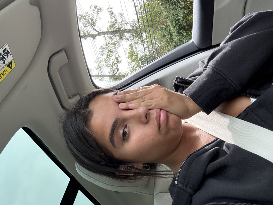 A young female is depicted in a self-portrait taken from inside a vehicle, specifically the passenger side