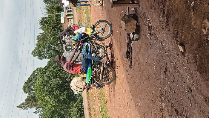 This image captures a roadside scene in Chevaywa ward, Kenya, under an overcast sky. In the foreground, a man wearing a red t-shirt and blue jeans sits barefoot on a blue and green motorcycle, which has a large, light-colored bundled object secured to its rear rack. Adjacent to him, a second man in a light-colored long-sleeved shirt and a dark cap stands, leaning towards the motorcycle. Their hands are positioned near the motorcycle's handlebars, indicating an interaction. The ground in the immediate vicinity is unpaved, consisting of reddish-brown dirt with scattered debris, including dark fabric pieces and small rocks. A large, light-colored natural rock and a portion of a wooden structure are visible on the right foreground. In the mid-ground, a paved road curves from right to left, and beyond it, several individuals are visible: a person in a black long-sleeved top and another in a white shirt. The background features dense green foliage from numerous trees and bushes, along with several single-story structures, possibly commercial buildings, and a utility pole.