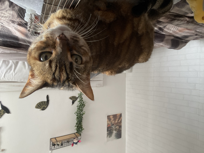 This image depicts an indoor scene within a room located in Canet de Mar, Spain. The central subject is a medium-sized cat with a brown, orange, and black tabby coat, green eyes, and prominent white whiskers, positioned in the foreground. The cat is seated on a bed, looking directly towards the camera. Its body partially obscures the neck and headstock of an acoustic guitar, visible beneath its chest; the guitar features a dark fretboard and white tuners. The bed is covered with a patterned blanket in shades of brown and cream, and white bedding is visible on the right side. The background features white walls, with the left wall exhibiting a white faux brick texture. Decorations on the rear wall include a small black wire shelf holding several small figures, including two recognizable as Mickey Mouse heads. Below the shelf, a faux green trailing plant hangs. Further to the right, three black, bird-shaped wall decorations with gold patterned interiors are affixed to the wall. A framed picture, depicting an outdoor street scene with figures and shadows, is mounted on the upper left portion of the rear wall, near the corner where it meets the faux brick wall. Natural light appears to illuminate the scene from the left.