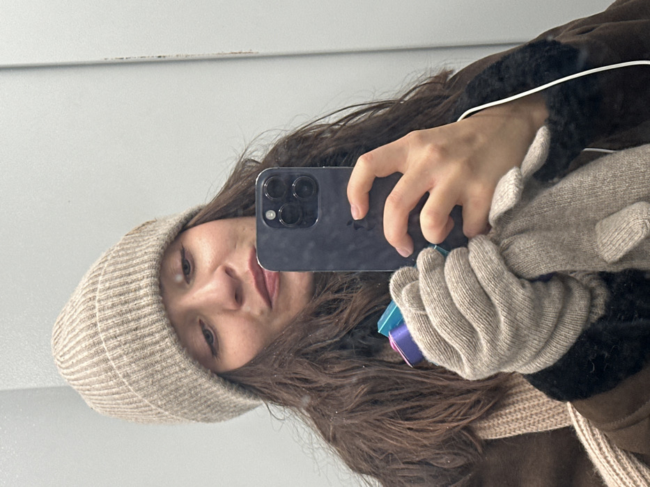 A female subject is depicted in a mirror selfie, located in Moscow, Russia. She wears a beige knit beanie, a brown shearling-lined coat, and a beige knit scarf. Her dark brown hair is visible. Her ungloved right hand holds a dark-colored smartphone, identified as an iPhone with a triple camera system, angled towards the mirror to capture the image. Her left hand, clad in a beige knit glove, holds several small, colorful objects (blue, purple, pink). Her facial expression shows slightly pursed lips. The background is a plain, light-grey reflective surface.