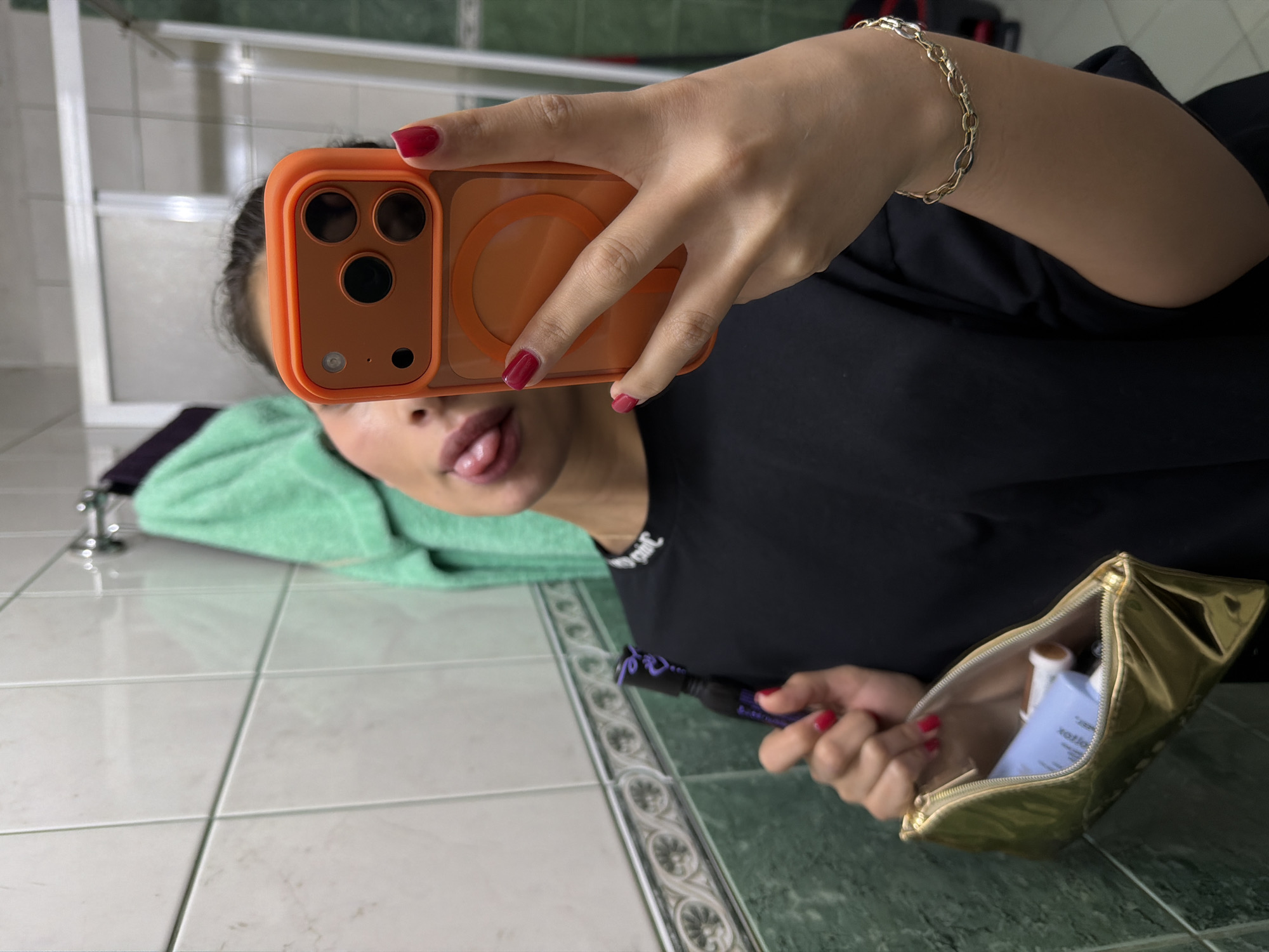 A person, presumably female based on the bracelet and painted nails, is taking a selfie with an orange-cased smartphone in what appears to be a bathroom. The person is sticking their tongue out slightly. The bathroom features white and green tiled walls and floors. A green towel is visible in the background near a faucet. The person is wearing a black shirt. In their other hand, they are holding a black tube of something alongside a gold makeup bag containing cosmetic products. There is nothing in the image to specifically indicate the location is Rudartsi, Bulgaria.