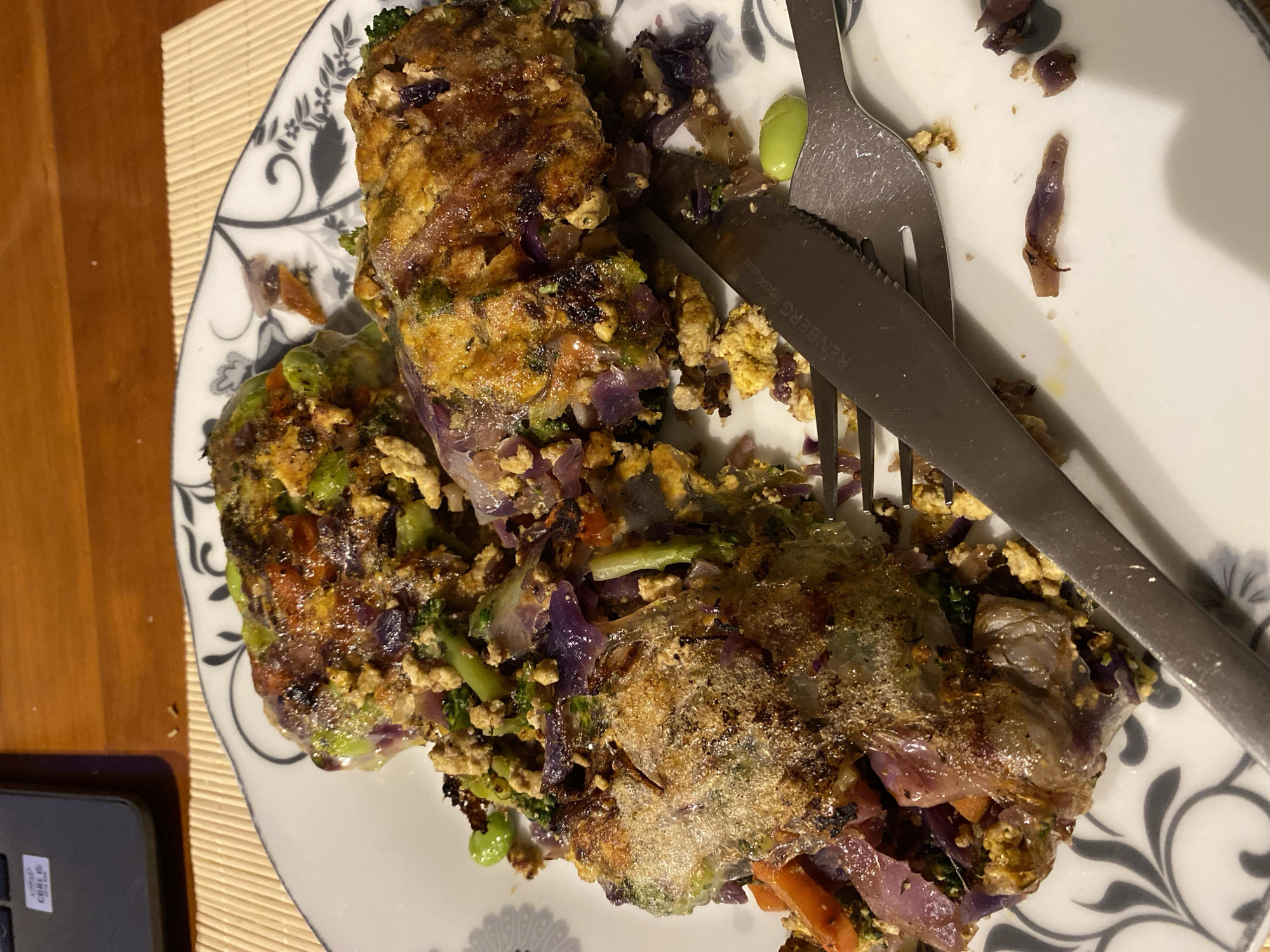 The image depicts a partially consumed meal on a patterned plate, with a fork and knife resting atop. The meal appears to consist of rolled, cooked vegetables, including red cabbage and broccoli, possibly with a protein component. A single edamame bean is also visible. The plate sits on a woven placemat, with a wooden surface and a portion of a black electronic device (likely a laptop or tablet) visible in the lower left corner. The setting is indoors, likely a private residence or dining area, but there is no way to determine its location in the city of Gijón/Xixón, Spain from this image alone.
