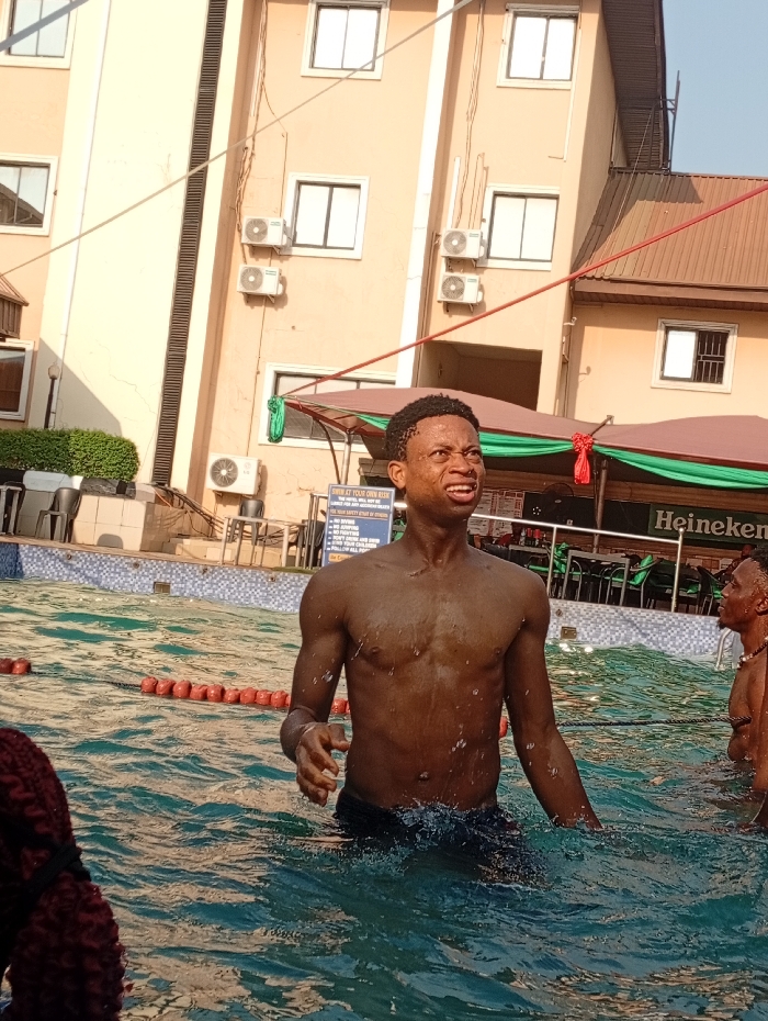 A man stands in a swimming pool, water splashing around his waist. He is shirtless and appears to be looking off to the side with a slight grimace. In the background is a building with multiple windows and air conditioning units, and a covered area with seating and Heineken signage. A second person is partially visible in the pool to the right, and what appears to be hair or a headdress is visible on the left. A pool divider stretches across the water.
