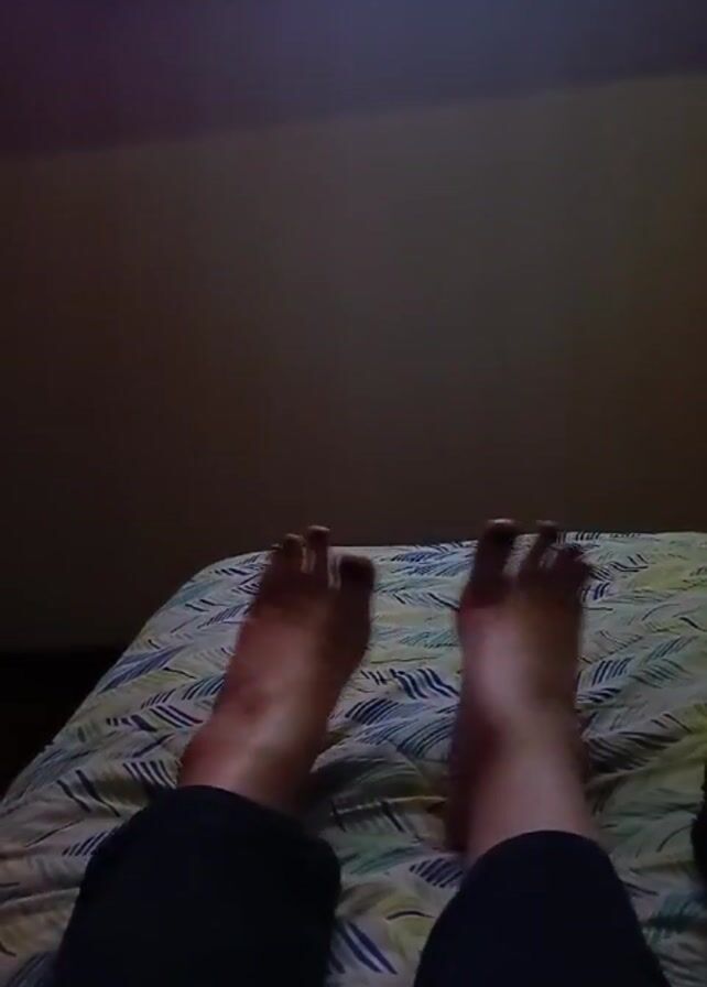 A person is lying on a bed, presumably watching television. The camera is positioned from the person's point of view, showing their lower legs and feet. They are wearing black pants. The bed has a blue, green, and white patterned comforter. The TV screen is visible at the top of the frame, although the content is not clear. The wall is a neutral color, illuminated with changing light from the TV.